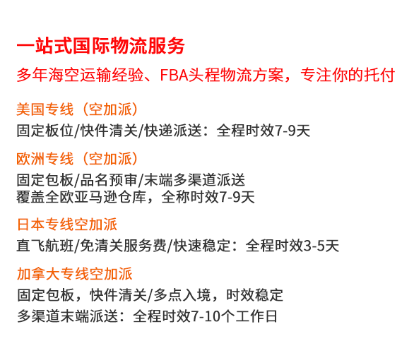業務范圍:國際快遞(DHL、UPS、FEDEX、TMT),亞馬遜FBA跨境電商(FBA海運、FBA空運、FBA快遞),敏感貨、專線出口服務